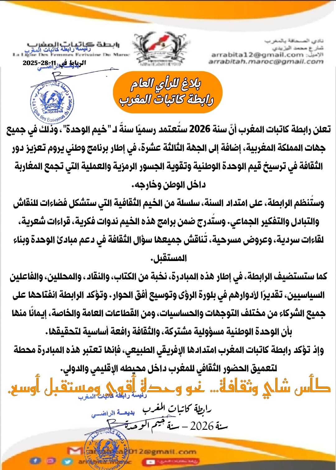 تعلن رابطة كاتبات المغرب أنّ سنة 2026 ستُعتمد رسميًا سنةً لـ “خيم الوحدة”، وذلك في جميع جهات المملكة المغربية، إضافة إلى الجهة الثالثة عشرة، في إطار برنامج وطني يروم تعزيز دور الثقافة في ترسيخ قيم الوحدة الوطنية وتقوية الجسور الرمزية والعملية التي تجمع المغاربة داخل الوطن وخارجه.