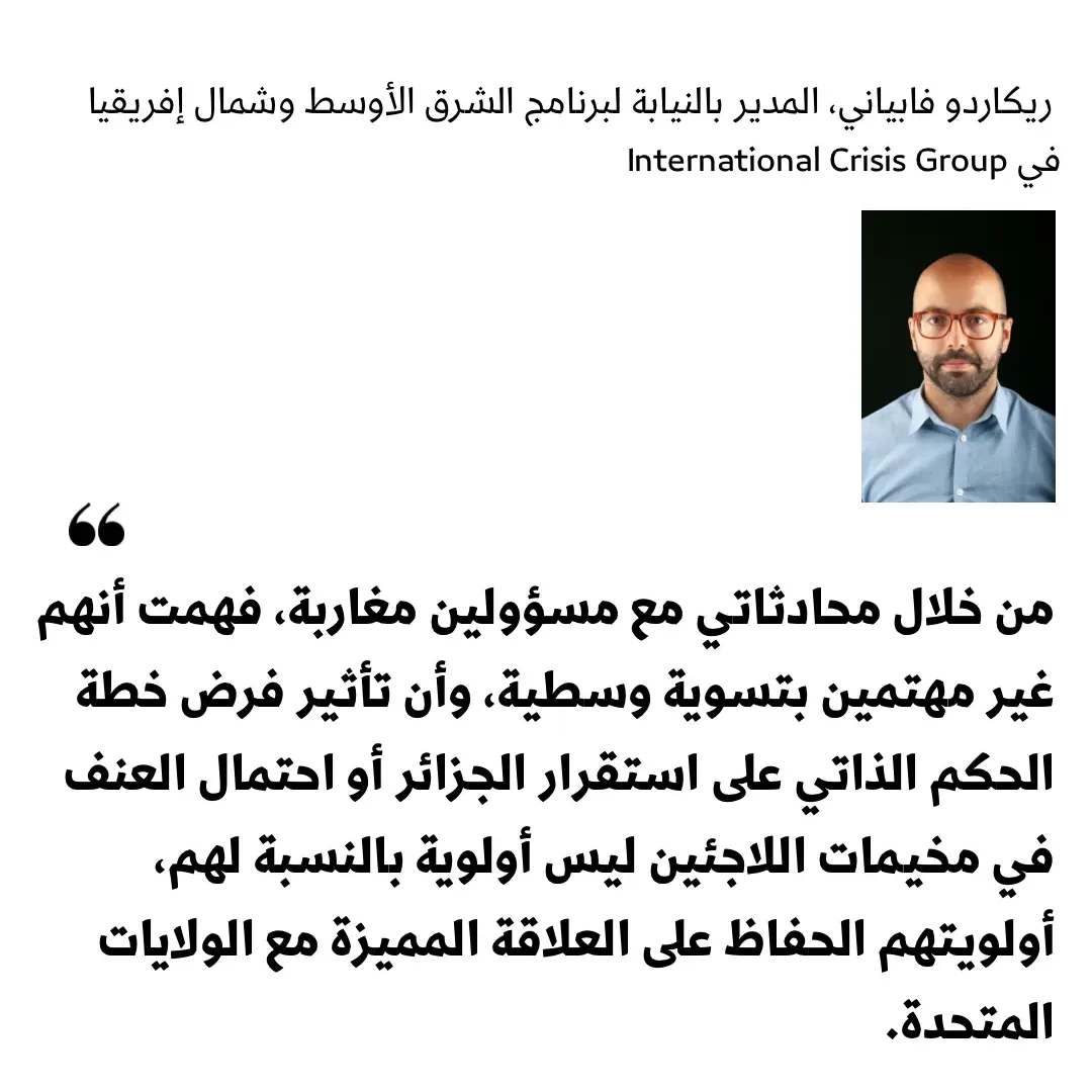 وأشار فابياني إلى أن هذا التحرك يأتي في سياق “إجماع دبلوماسي متزايد لصالح المغرب” مستحضرا اعتراف الولايات المتحدة بسيادة الرباط على الصحراء وموقف باريس الذي اعتبر أن “الحكم الذاتي تحت السيادة المغربية هو الإطار الذي ينبغي أن تحل ضمنه هذه القضية”. وقال إن المسؤولين المغاربة الذين تحدث إليهم “غير مهتمين بتسوية وسطية”، مضيفا: “من خلال محادثاتي مع مسؤولين مغاربة، فهمت أنهم غير مهتمين بتسوية وسطية، وأن تأثير فرض خطة الحكم الذاتي على استقرار الجزائر أو احتمال العنف في مخيمات اللاجئين ليس أولوية بالنسبة لهم، أولويتهم الحفاظ على العلاقة المميزة مع الولايات المتحدة”. معتبرا أن هذا التوجه يعكس رهان الرباط على ميزان القوى الدولي أكثر من البحث عن تسوية تفاوضية تقليدية.