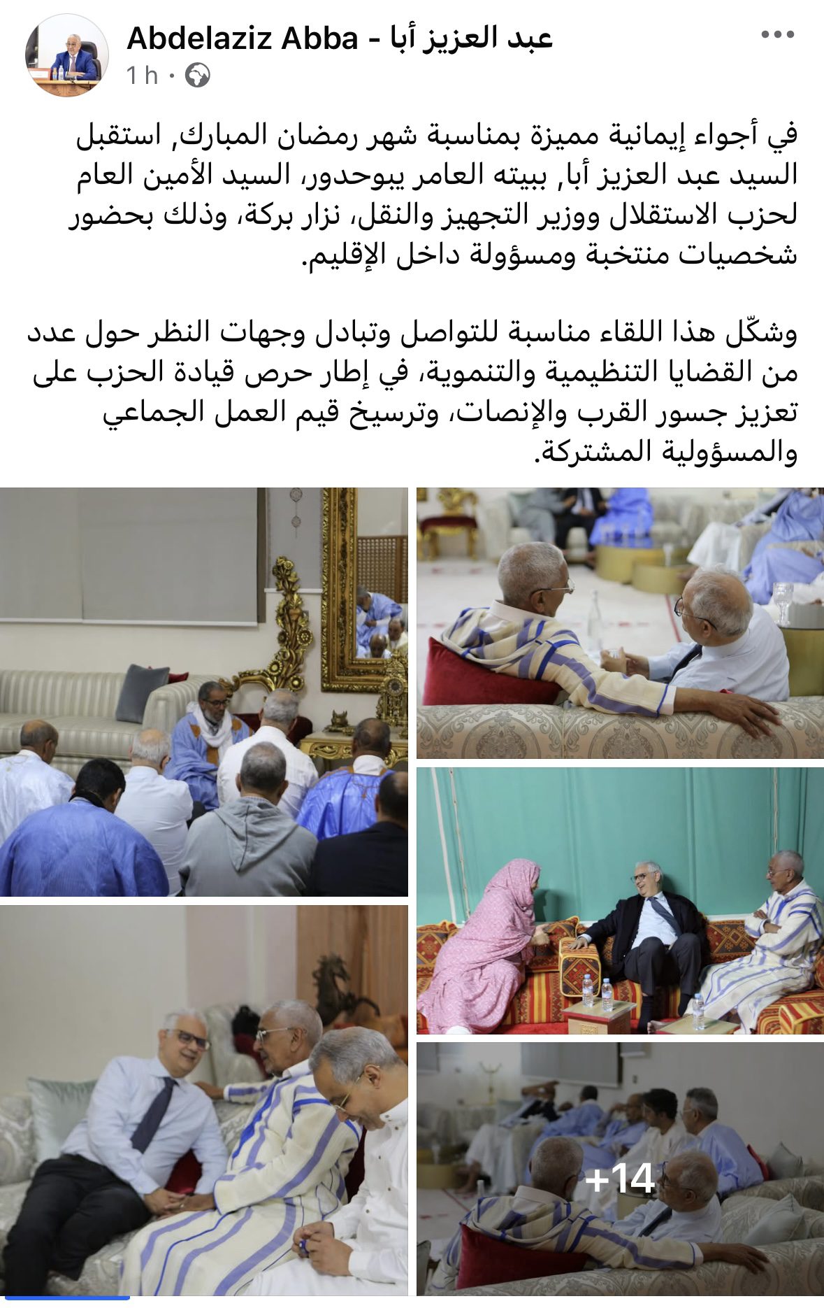 شهدت مدينة بوجدور، مساء اليوم، تحركاً سياسياً أثار جدلا واسعاً بالرأي العام البوجدوري، بعد حلول نزار بركة الأمين وزير التجهيز والماء والأمين العام لحزب الاستقلال، ضيفاً بـ “قصر” القيادي الاستقلالي ورئيس المجلس البلدي لبوجدور، عبد العزيز آبا. هذه الزيارة، وإن غُلفت بطابع “التواصل الحزبي”، إلا أنها وضعت علامات استفهام كبرى حول توقيتها ودلالاتها في ظل سياق وطني يلح على ضرورة التغيير.