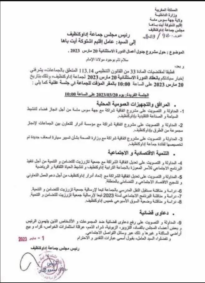 تداول مجموعة من النشطاء ،مراسلة لرئيس جماعة إداوكنظيف بإقليم اشتوكة آيت باها بجهة سوس ماسة، موجهة لعامل قليم اشتوكة في شأن مشروع جدول أعمال الدورة الإستثنائية المزمع انعقادها يوم 20 مارس الجاري ، تنص صراحةفي نقطتها التاسعة ، المدرجة في جدول أعمال الدورة ،على رفع دعوى قضائية على متهمي أعضاء المجلس الجماعي عبر وسائل التواصل الاجتماعي.