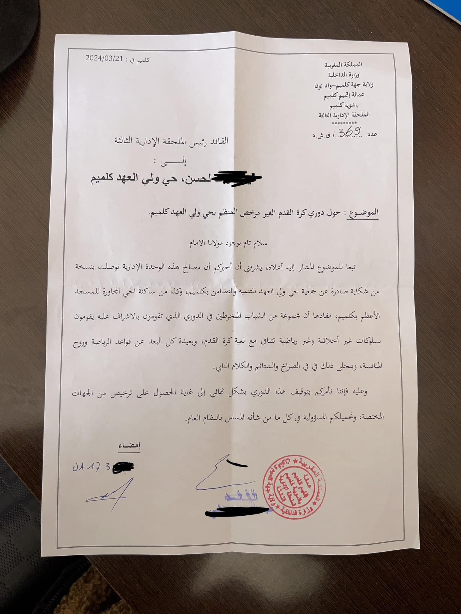 وبينت مراسلة الملحقة الإدارية ذاتها إلى الجهة المنظمة، الصادرة تحت رقم 369، أن الشكايات أكدت كون “هذه السلوكيات تظل بعيدة كل البعد عن قواعد الرياضة وروح المنافسة من خلال الصراخ والشتائم والكلام النابي”، الأمر الذي دفع السلطات إلى “الأمر بتوقيف الدوري بشكل نهائي إلى غاية الحصول على ترخيص من الجهات المختصة وتحمل المسؤولية في كل ما من شأنه المساس بالنظام العام”.