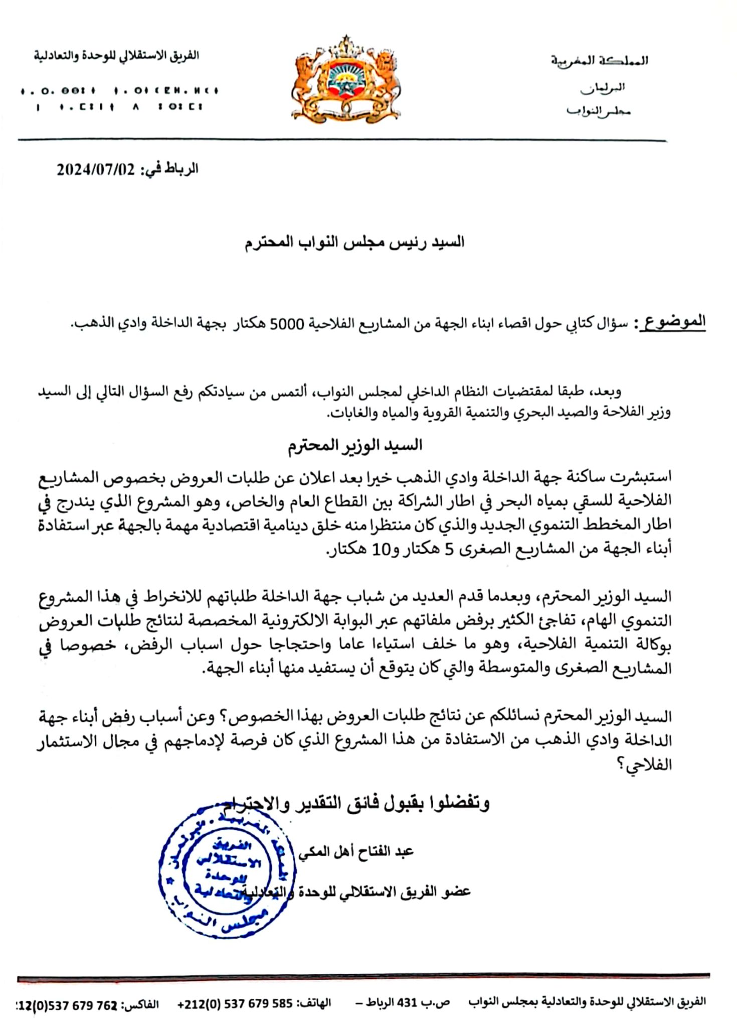 وجه النائب البرلماني عبد الفتاح المكي عن جهة الداخلة سؤالاً كتابياً إلى وزير الفلاحة والصيد البحري والتنمية القروية والمياه والغابات، محمد صديقي، يستفسر فيه عن أسباب وراء إقصاء أبناء جهة الداخلة وادي الذهب من الاستفادة من المشاريع الفلاحية التي كانت تهدف إلى إدماجهم في مجال الاستثمار الفلاحي.