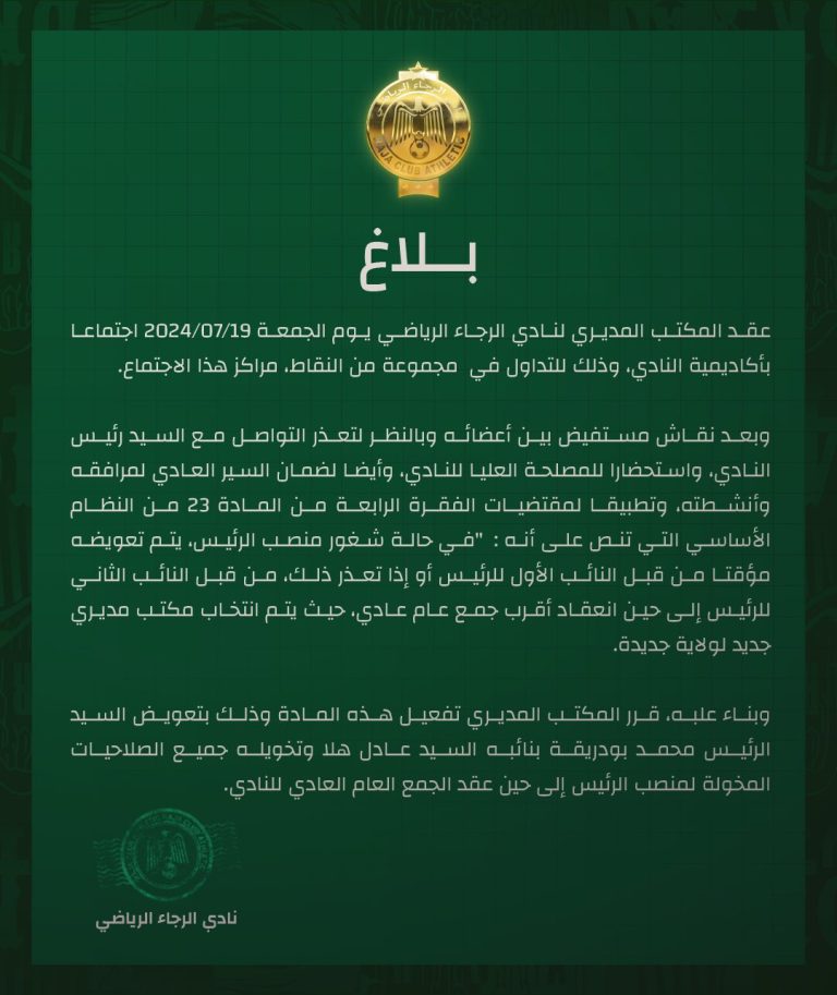 أعلنت المكتب المسير لنادي الرجاء البيضاوي رسمياً في بلاغ له، شغور منصب رئيس النادي.