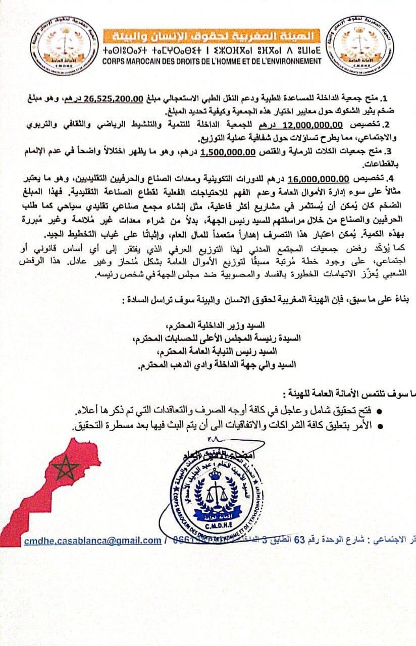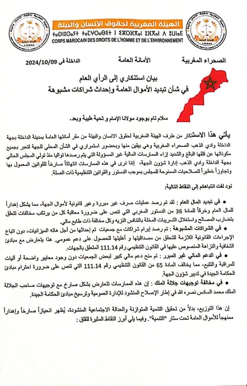 و البيئة بمقرها المركزي الكائن بالداخلة، بيان استنكاري ضد مجلس جهة الداخلة وادي الذهب بخصوص تبديد المال العام عبر إحداث شراكات مشبوهة.