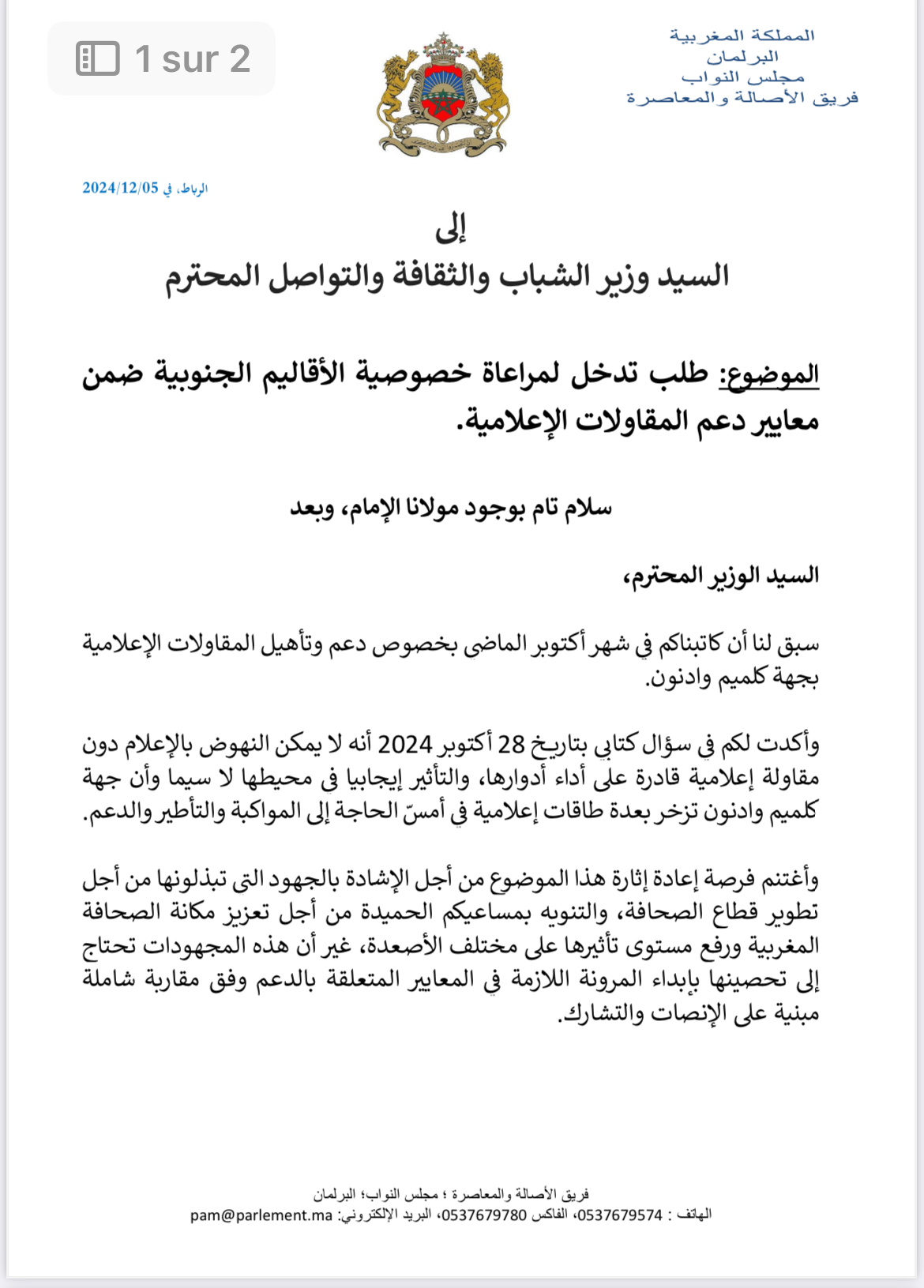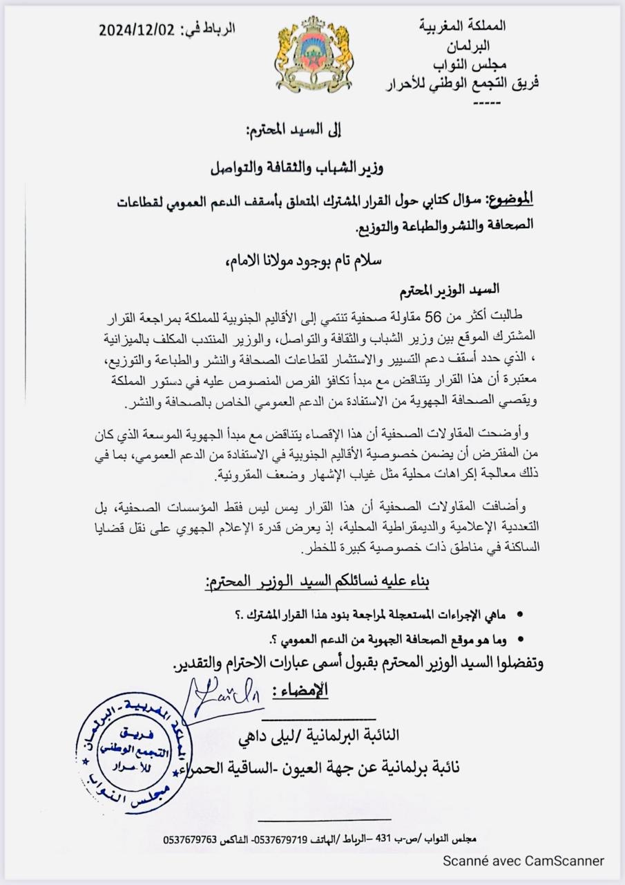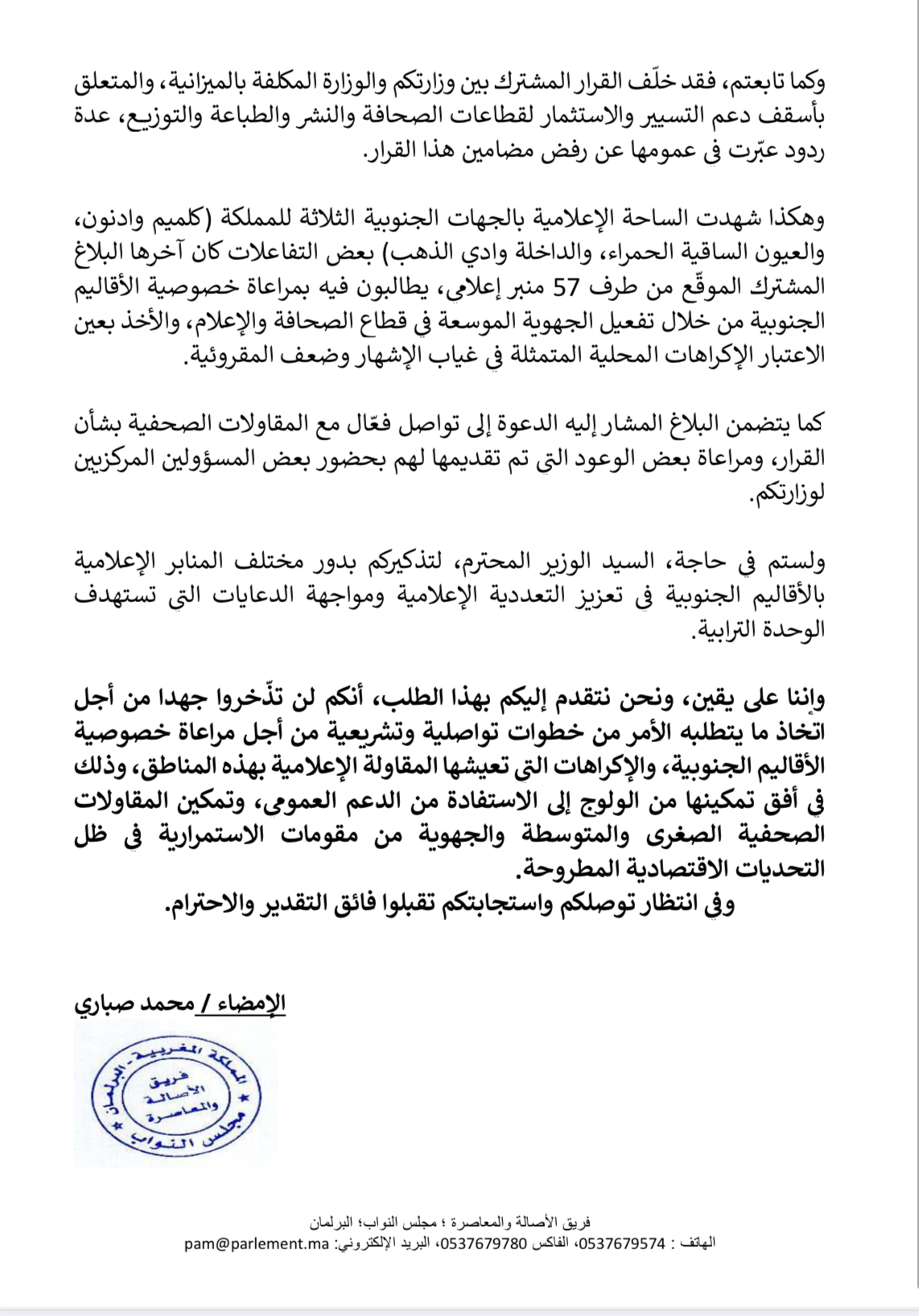 وفي اطار الترافع عن قضية الجسم الصحفي بالصحراء وفي ظل التضامن المستمر مع الصحافة الجهوية بالجهات الجنوبية الثلاث، إنضم كل من السادة ممثلين الأمة السيدة ليلى داهي نائبة برلمانية عن جهة العيون الساقية الحمراء وكذا السيد محمد صباري النائب البرلماني عن جهة كلميم واد نون، إلى توجيه السؤال للوزير الوصي عن القطاع بخصوص مصير المقاولات الصحفية بالصحراء خصوصا في ظل عدم مراعات خصوصية المنطقة بما تحمله من إستثناءات.