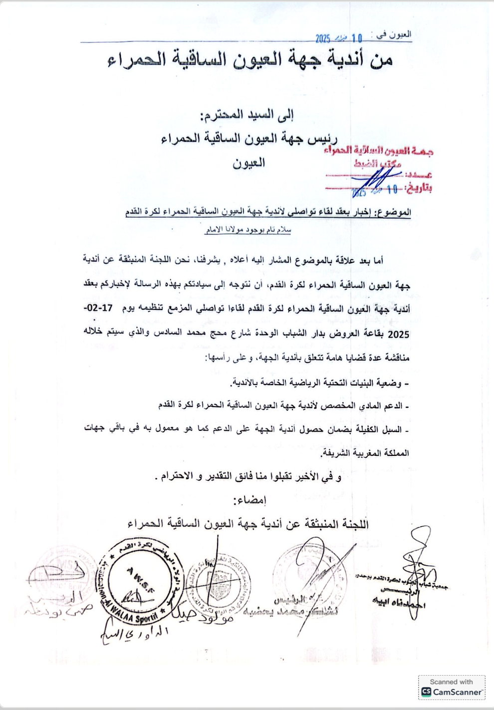 وقد راسلت اللجنة المنظمة الجهات المسؤولة، من بينها والي جهة العيون الساقية الحمراء ورئيس الجهة، لإبلاغهم بأهمية هذا اللقاء ودعوتهم للمشاركة في النقاش، بهدف إيجاد حلول عملية تساهم في إنقاذ الأندية من الوضعية الصعبة التي تعاني منها.