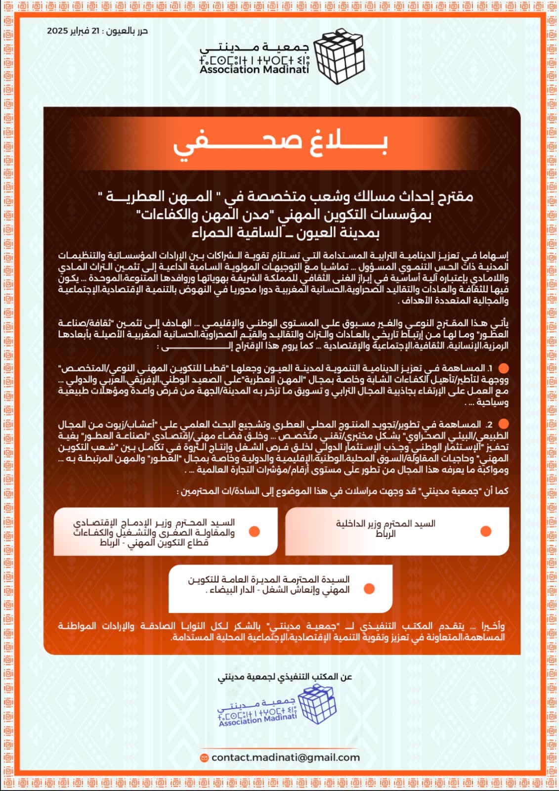 - المساهمة في تطوير/تجويد المنتوج المحلي العطري وتشجيع البحث العلمي على “أعشاب/زيوت من المجال الطبيعي/البيئي الصحراوي” بشكل مختبري/تقني متخصص … وخلق فضاء مهني/إقتصادي “لصناعة العطور” بغية تحفيز “الإستثمار الوطني وجذب الإستثمار الدولي لخلق فرص الشغل وإنتاج الثروة في تكامل بين “شعب التكوين المهني” وحاجيات المقاولة/السوق المحلية،الوطنية،الإقليمية والدولية وخاصة بمجال “العطور” والمهن المرتبطة به … ومواكبة ما يعرفه هذا المجال من تطور على مستوى أرقام/مؤشرات التجارة العالمية … .