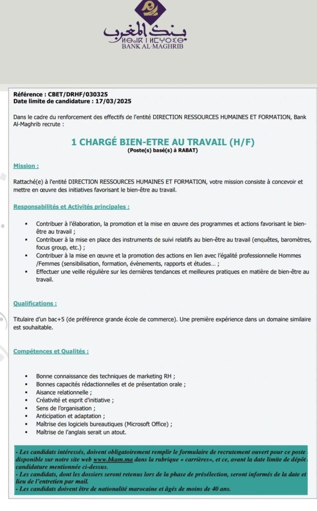 وبحسب إعلان البنك، سيكون المسؤول المعين تابعًا لإدارة الموارد البشرية والتكوين داخل المؤسسة. كما حدد البنك شروطًا لهذا المنصب، من بينها المساهمة في تطوير وتنفيذ البرامج والإجراءات التي تعزز رفاهية الموظفين في العمل، إلى جانب تنفيذ السياسات المتعلقة بالمساواة المهنية بين الرجل والمرأة.