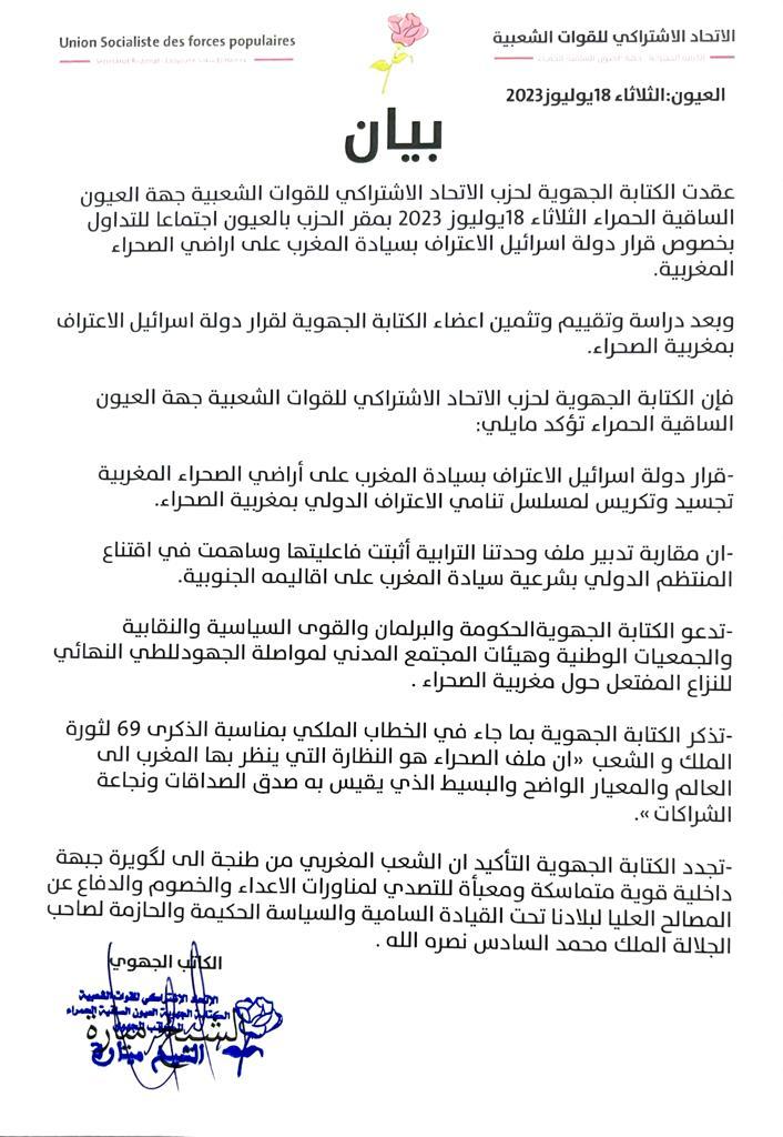 وقد تكلل الإجتماع بإصدار بلاغ إلى الرأي العام الوطني والدولي، توصلت به جريدة “صحراء توذوس” والذي أكدت عبره الكتابة الجهوية للإتحاد الإشتراكي بالعيون، أن الإعتراف الإسرائيلي يعتبر تجسيد لسلسلة من الإعترافات الدولية والمتنامية بمغربية الصحراء.