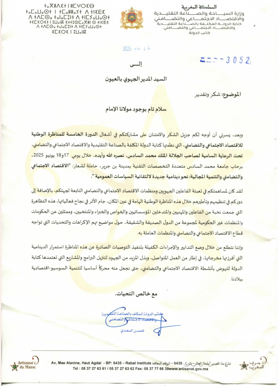 وجه كاتب الدولة في الحكومة تنويهاً وتقديراً خاصاً للسيد محمد سالم بوديجة، المدير الجهوي للصناعة التقليدية والاقتصاد الاجتماعي والتضامني بجهة العيون الساقية الحمراء، تقديراً للجهود المبذولة في تطوير القطاع وتفعيل مشاريع البرنامج الملكي التنموي على مستوى الجهة.