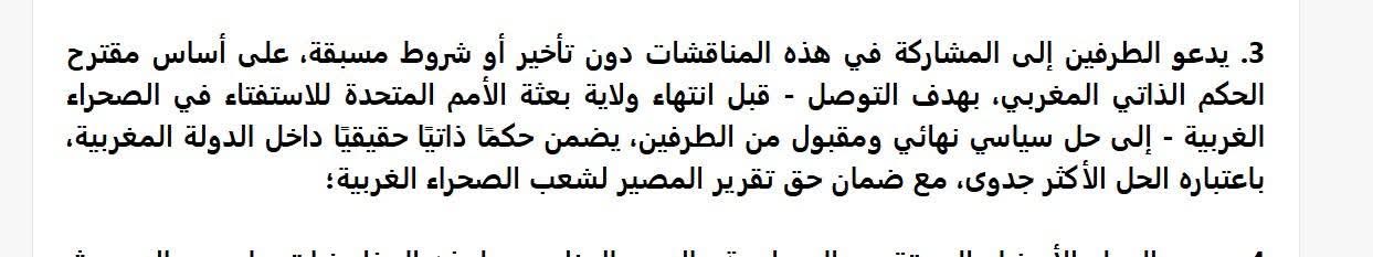وذكرت المسودة أن مبادرة الحكم الذاتي المغربية، المقدمة في 11 أبريل 2007، تمثل “خطة جادة وموثوقة وواقعية”، معتبرة أن الحكم الذاتي الحقيقي تحت السيادة المغربية هو “الحل الأكثر جدوى”، ومشددة على ضرورة انخراط جميع الأطراف في المفاوضات دون تأخير أو شروط مسبقة.