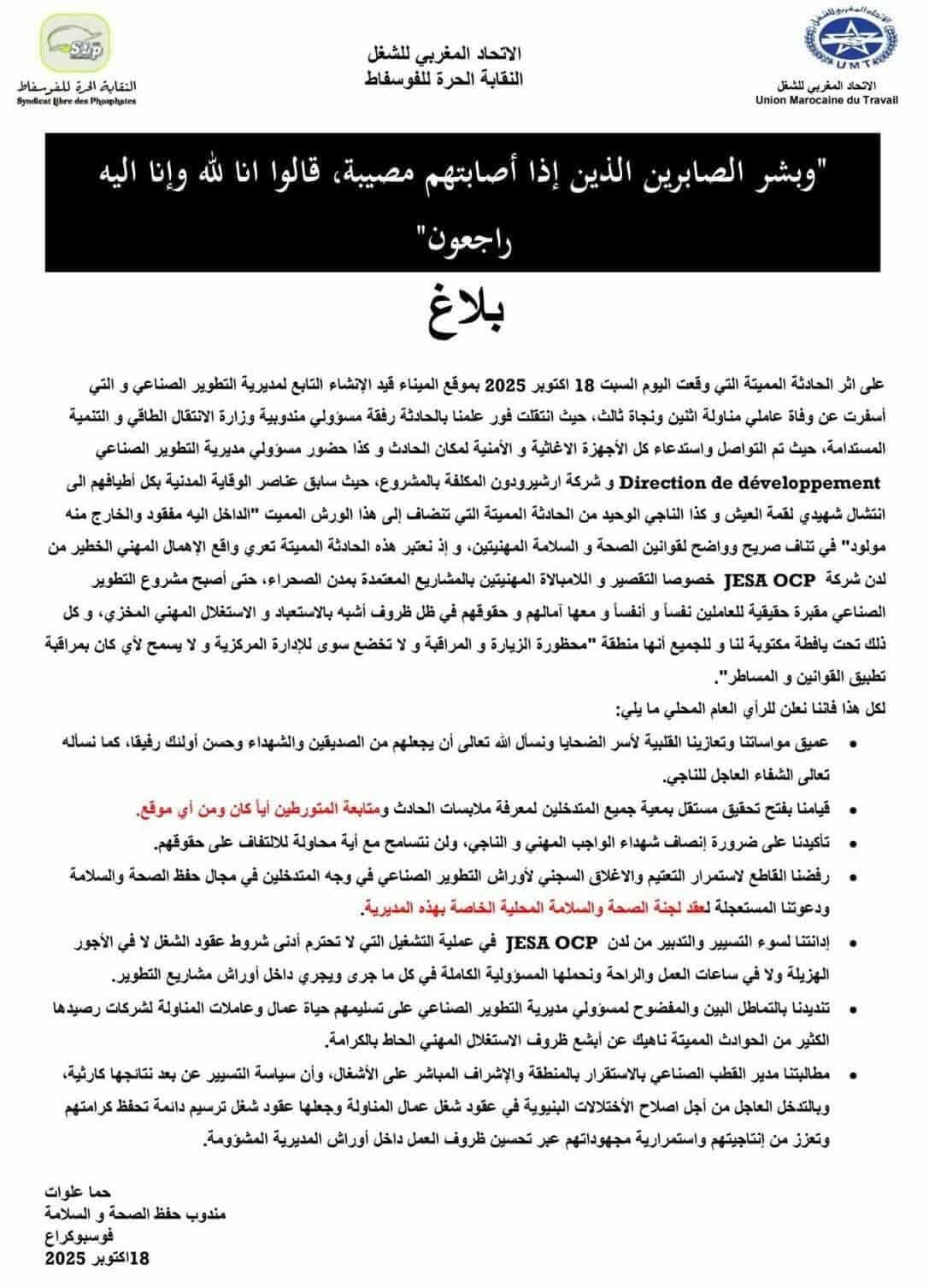 وفق بلاغ صادر عن النقابة الحرة للفوسفاطيين المنضوية تحت لواء الاتحاد المغربي للشغل (UMT)، فإن الحادث وقع بموقع تابع لمديرية التطوير الصناعي Direction de développement، في ظروف وُصفت بـ“الخطيرة والمأساوية”، حيث تسببت في وفاة عاملين على الفور نتيجة غياب عناصر الوقاية الأساسية داخل الورش.