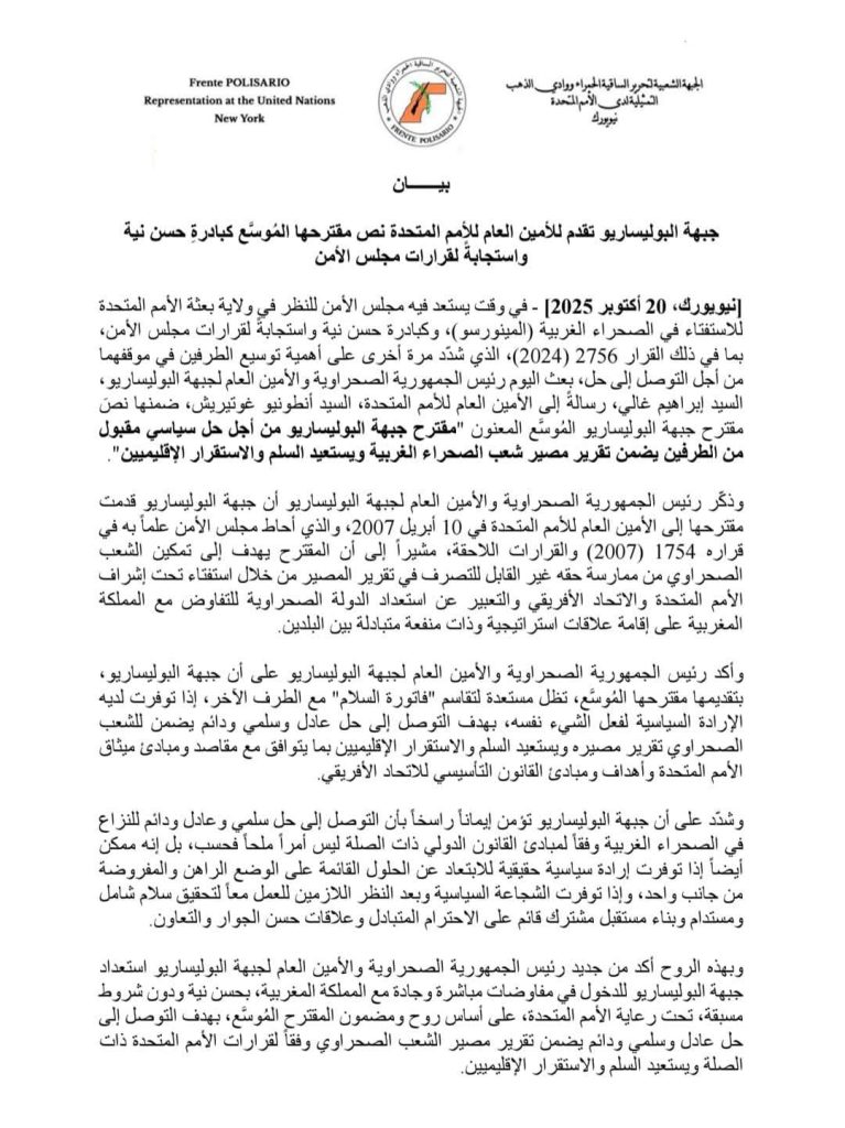 في خضم المداولات الجارية داخل مجلس الأمن الدولي بشأن مشروع القرار الأمريكي الجديد المتعلق بقضية الصحراء، وجهت جبهة البوليساريو رسالة إلى الأمين العام للأمم المتحدة، أنطونيو غوتيريش، قدّمت فيها ما وصفته بـ“مبادرة حسن نية” تهدف إلى إحياء العملية السياسية وإشراك جميع الأطراف في تحمل مسؤولياتها لإنهاء النزاع.